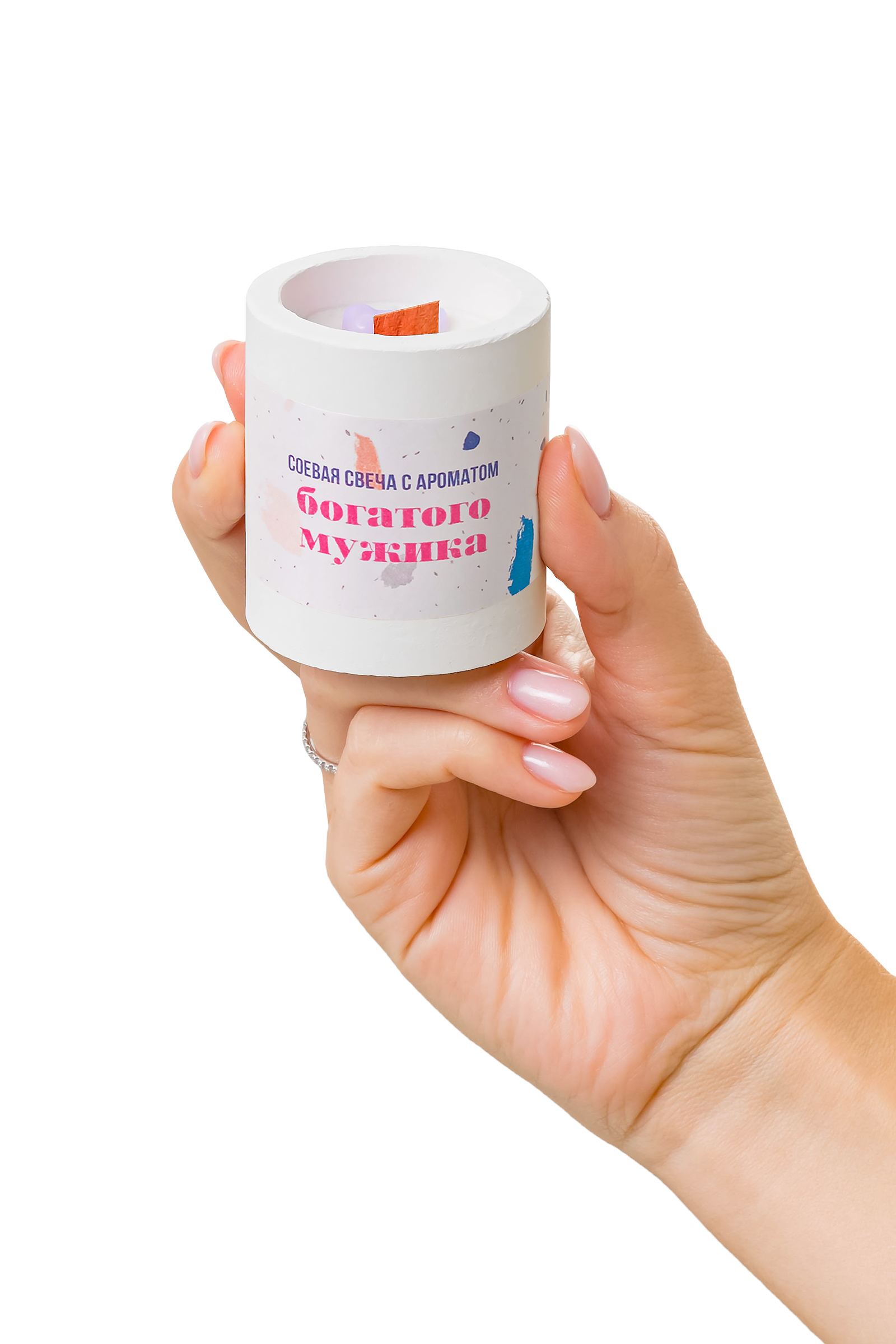 Соевый воск, ароматизатор, деревянный фитиль. Тара для свечи изготовлена из скульптурного гипса.