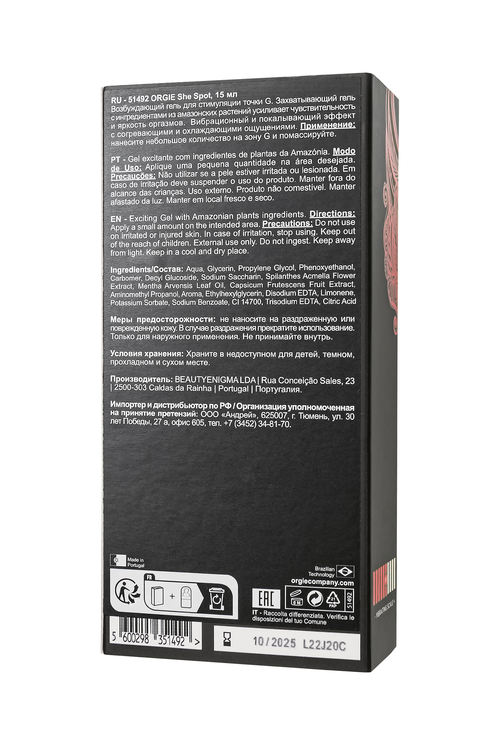 Интимный гель для точки G Орджи She Spot – ваш путь к невероятным ощущениям. Этот гель создан для удовольствия. Забудьте о рутине и откройте новый мир возможностей с интенсивным вибрационным и покалывающим эффектом. Формула She Spot, обогащенная активными ингредиентами, приносит непередаваемые ощущения, которые усиливаются развивающимися согревающими, охлаждающими и даже легкими пряными нотками. В этот момент вы ощущаете нечто невероятное, словно погружаясь в водопад наслаждения. Однако этот интимный гель не только для нее. Этот продукт разработан так, чтобы партнеры могли наслаждаться им вдвоем. Он создает возможность делиться моментами удовольствия и экспериментировать с новыми ощущениями вдвоем. Специально разработанный для стимуляции точки G, гель делает еще более чувствительным каждое прикосновение. Продукт прошел строгие исследования, включая дерматологические и гинекологические тесты, а также исследования эффективности. Простота использования – еще одно его преимущество. Просто нанесите небольшое количество на интимные зоны и позвольте магии начать действовать. Orgie рекомендует начать с минимальной дозы и настроить дозировку в соответствии с вашими желаниями и комфортом. Функция интимного геля ORGIE She Spot заключается в создании мгновенных интенсивных ощущений для женщин и для пар. Откройте дверь в волшебный новый мир удовольствия с этим уникальным гелем.