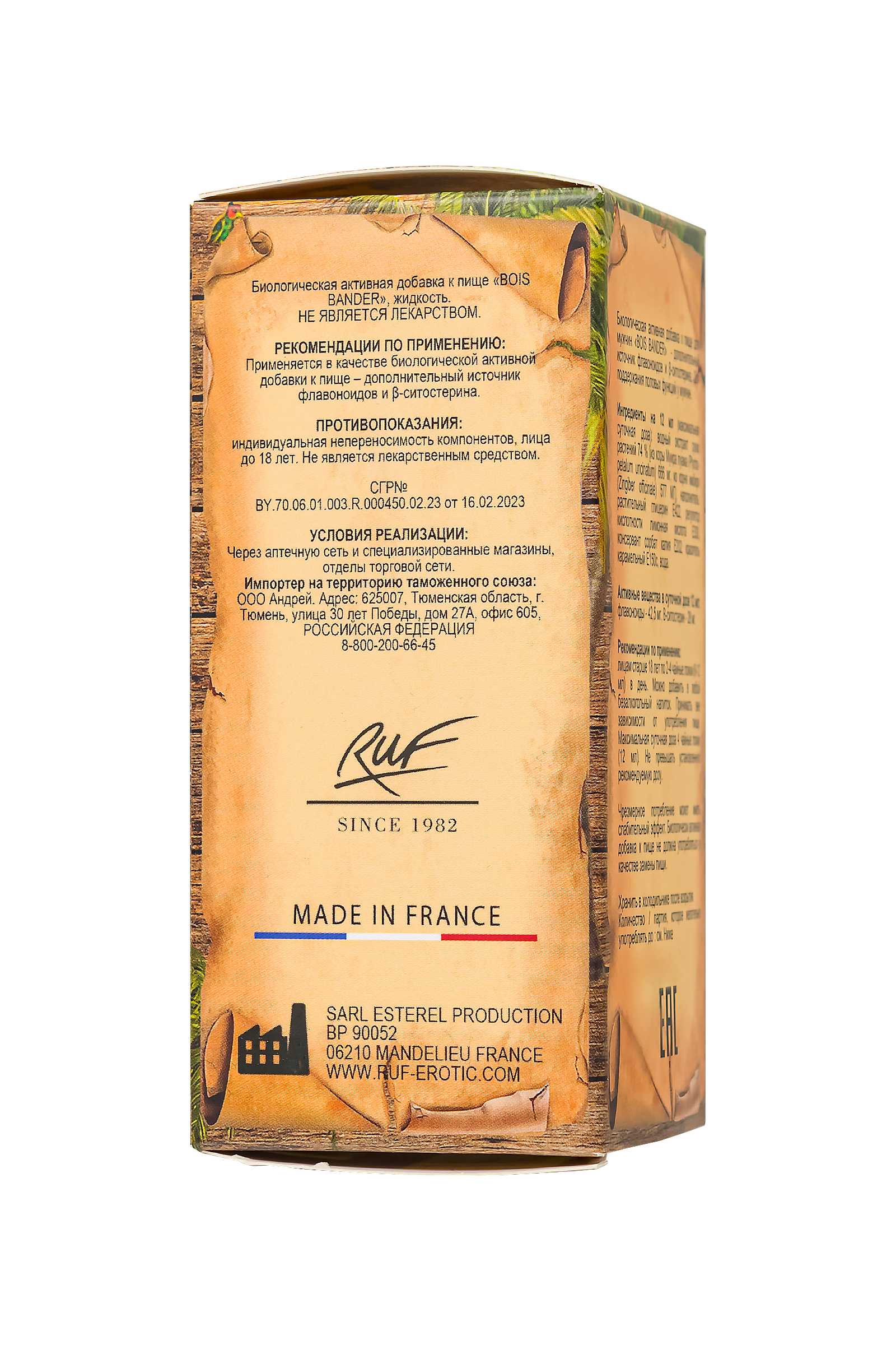 Сексуальный стимулятор Буа Бандер для мужчин от РУФ - это инновационный препарат для яркой сексуальной жизни. Эффективная диетическая добавка из Франции создана на основе высококачественного экстракта бразильской муира-пуамы и имбиря. Специально созданная формула помогает повысить либидо и обеспечивает прочную эрекцию, поддерживая нормальную сексуальную функцию. Йохимбин в составе активно способствует улучшению кровотока, обеспечивая уверенность и удовлетворение во время полового акта. Bois Bander предназначен для тех, кто стремится поддерживать нормальную сексуальную функцию, повышать либидо и обеспечивать стабильную эрекцию. 30+ Способ применения: Взрослым мужчинам по 2-4 чайные ложки (6-12 мл) в день вне зависимости от приема пищи. Можно добавить в любой безалкогольный напиток. Максимальная суточная доза 4 чайные ложки (12 мл). Не превышать установленную рекомендуемую дозу. Чрезмерное потребление может иметь слабительный эффект. Биологически активная добавка к пище не должна употребляться вместо пищи.