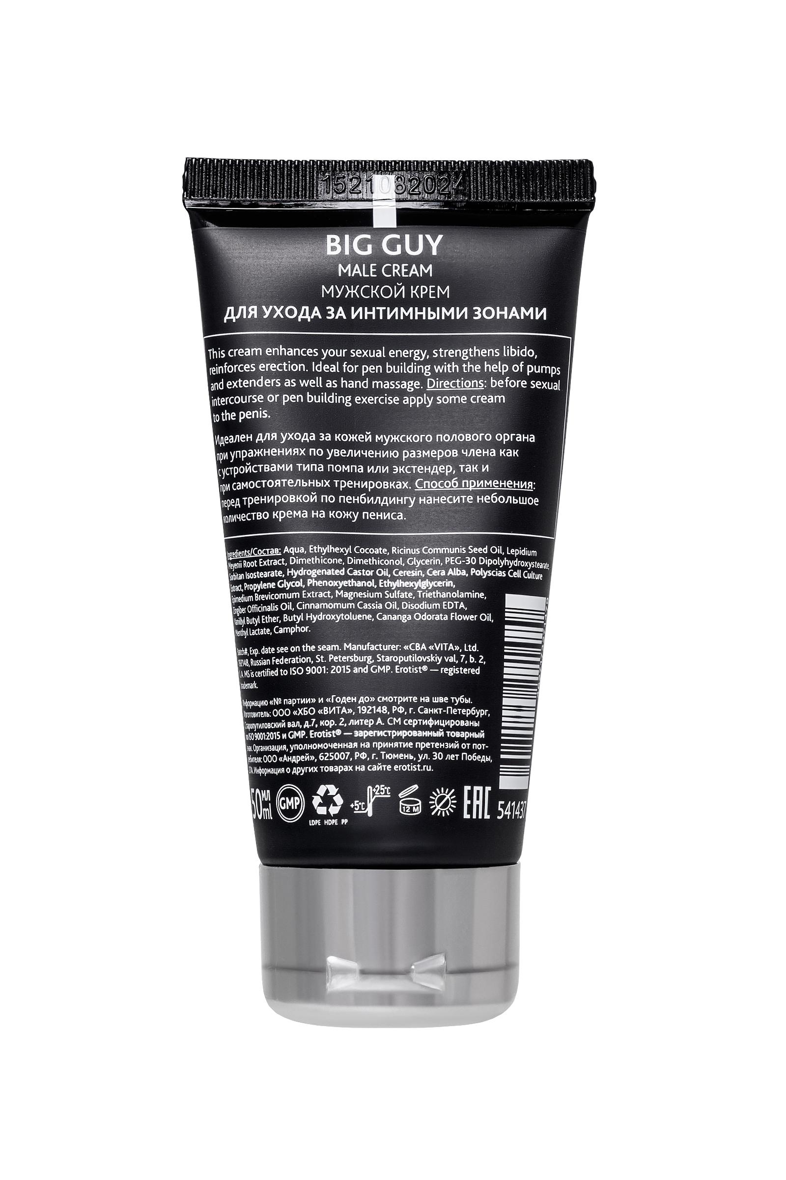 Каждый мужчина хочет быть состоятельным в сексуальной сфере. Не секрет, что во многом успех зависит от размера полового члена и мужской выносливости. Крем для пенбилдинга Эротист Big Guy станет эффективным помощником для достижения внушительных результатов в тренировках. Активные вещества – экстракт горянки и маки перуанской способствуют росту пениса, укреплению эрекции и увеличению продолжительности полового акта. Стимулирующие компоненты улучшают эластичность тканей и кровообращение, ухаживают за нежной кожей пениса во время тренировок. Крем Big Guy идеально подойдет для тех мужчин, которых не устраивает: размер полового члена низкий уровень чувствительности недостаточно продолжительный половой акт Скромность украшает только если это не касается размера полового члена. Вооружись эффективным кремом для увеличения пениса Big Guy, и уже через 3 недели регулярных тренировок результат не заставит себя ждать. Способ применения: Небольшое количество крема втирайте по всему пенису перед тренировкой по пенбилдингу. Используйте крем совместно с вакуумными помпами или экстендерами, а также в самостоятельных тренировках по пенбилдингу.