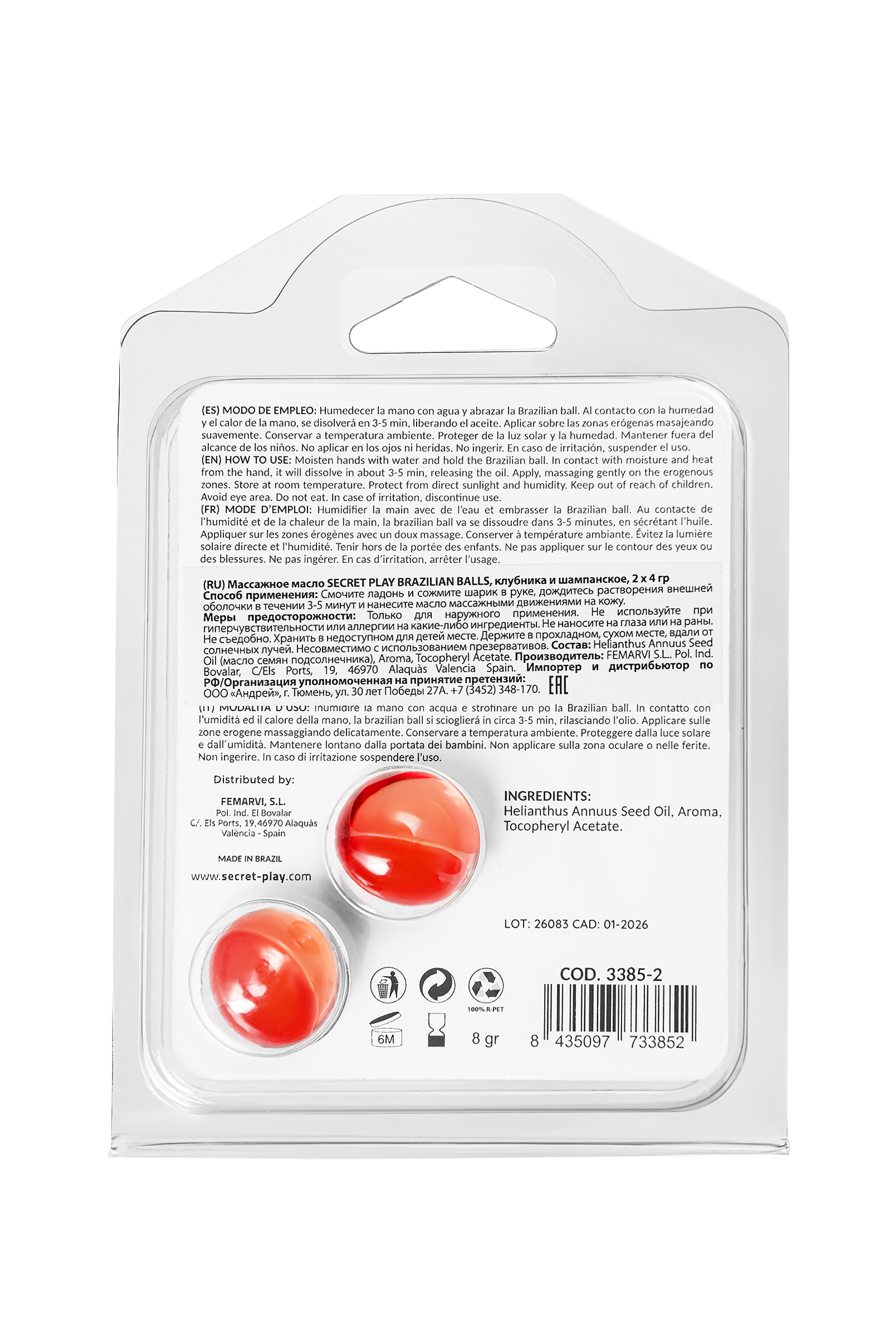 Brazilian Balls Strawberry & Sparkling Wine — это соблазнительное массажное масло от Secret Play, которое подарит вам незабываемые моменты страсти и наслаждения. Эти бразильские шарики созданы для тех, кто хочет добавить нотку романтики и игривости в свои интимные игры. Каждый шарик наполнен ароматным массажным маслом с восхитительным сочетанием клубники и игристого вина, которое будоражит чувства и создает атмосферу праздника и чувственности. Эти шарики тают в ваших руках, раскрываясь под воздействием тепла и влажности, и превращаются в шелковистое масло, идеально подходящее для мягких и чувственных прикосновений. Окунитесь в атмосферу наслаждения: легкий аромат клубники и игристого вина пробуждает все чувства, добавляя романтики и игривости в ваши интимные моменты. Как это работает? Просто смочите руку водой, обнимите шарик ладонью, и он начнет таять, превращаясь в масло с нежным ароматом клубники и игристого вина. Через 3–5 минут шарик полностью растворится, и вы сможете нанести масло на любимые эрогенные зоны, наслаждаясь мягкими прикосновениями и волнующим ароматом. Позвольте Brazilian Balls Strawberry & Sparkling Wine от Secret Play сделать ваши интимные моменты еще более сладкими, романтичными и волнующими. Насладитесь атмосферой праздника и чувственности в каждом прикосновении! Необычный формат, который добавляет интригу и страсть в интимные игры Аромат клубники и игристого вина пробуждает чувства и создает романтическое настроение Превращается в нежное масло для чувственного массажа, даря мягкое и приятное скольжение Простота использования: достаточно тепла и влажности рук, чтобы шарик растаял Идеально подходит для прелюдий, эротического массажа и нежных ласк В комплекте: 2 бразильских шарика по 4 грамма каждый Внешний слой — вода, внутренняя жидкость — масло Несовместимо с использованием презервативов Состав: Масло семян Helianthus Annuus, ароматизатор, токоферилацетат. Способ применения: Смочите руку водой и обнимите ладонью шарик, чтобы он начал таять. Подержите шарик в ладони, пока он полностью не растворится (3–5 минут). Нанесите полученное масло легкими массирующими движениями на любимые эрогенные зоны и наслаждайтесь нежными прикосновениями и волнующим ароматом. Меры предосторожности: Храните при комнатной температуре, избегая прямых солнечных лучей и высокой влажности. Не наносите на область глаз или поврежденную кожу. Не глотайте и храните в недоступном для детей месте. Прекратите использование при возникновении раздражения. Не совместимо с использованием презервативов.
