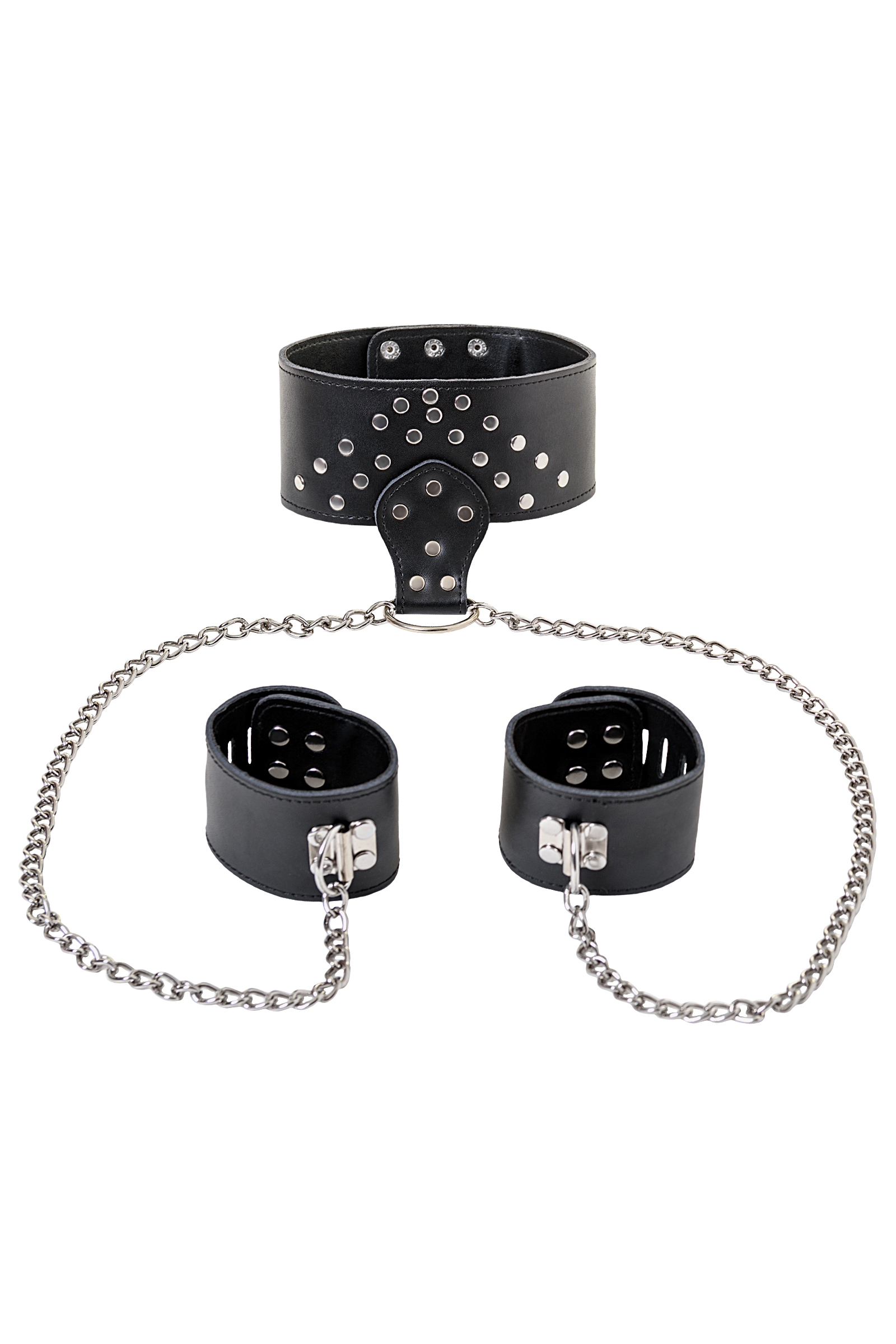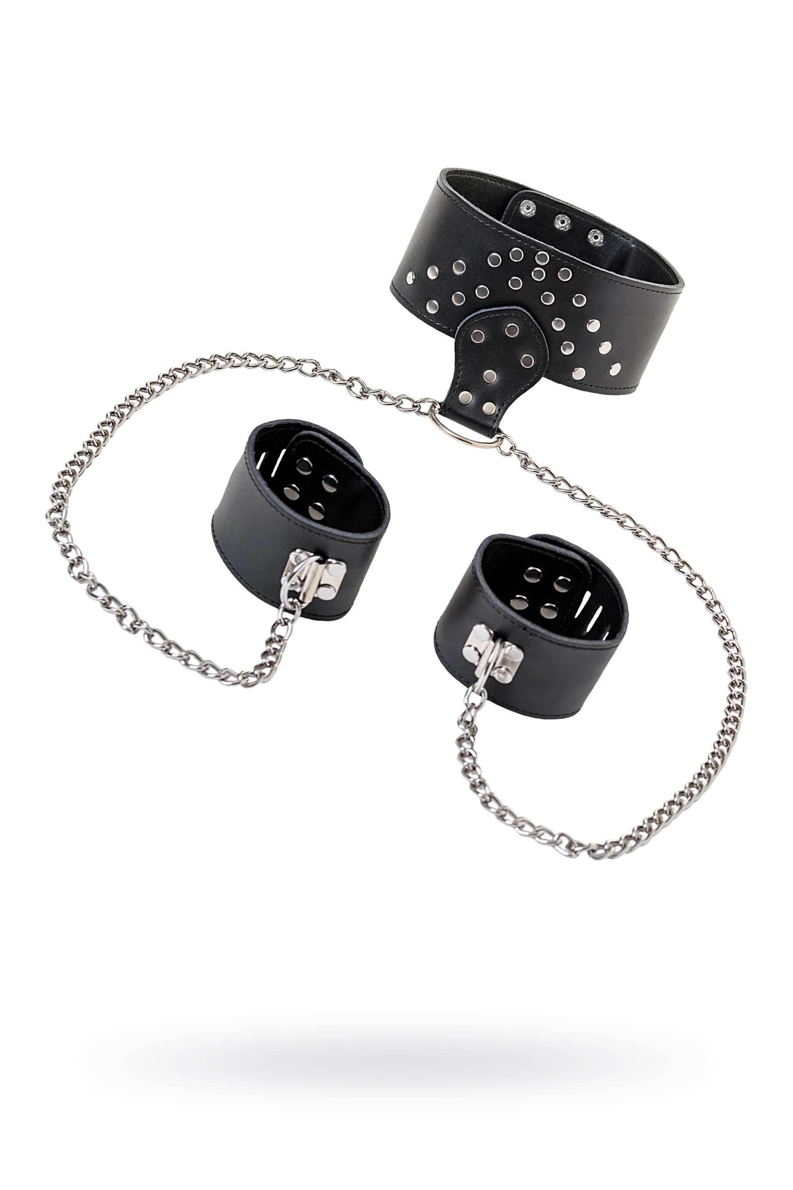 Ошейник с наручниками - удивительный набор из эксклюзивной коллекции TOYFA Theatre, изготовленный из натуральной высококачественной кожи. Все детали декорированы сверкающими металлическими заклёпками, создающими контраст с чёрным кожаным фоном. Наручники присоединяются к ошейнику с помощью тонких цепей. Длина каждой из них составляет пятьдесят сантиметров – этого достаточно для того, чтобы несколько ограничить свободу движений прекрасной пленницы, но при этом не причинить ей серьёзного дискомфорта. Размер аксессуаров регулируется, поскольку они оснащены тремя рядами кнопочек. Благодаря такому решению любая девушка будет чувствовать себя комфортно.